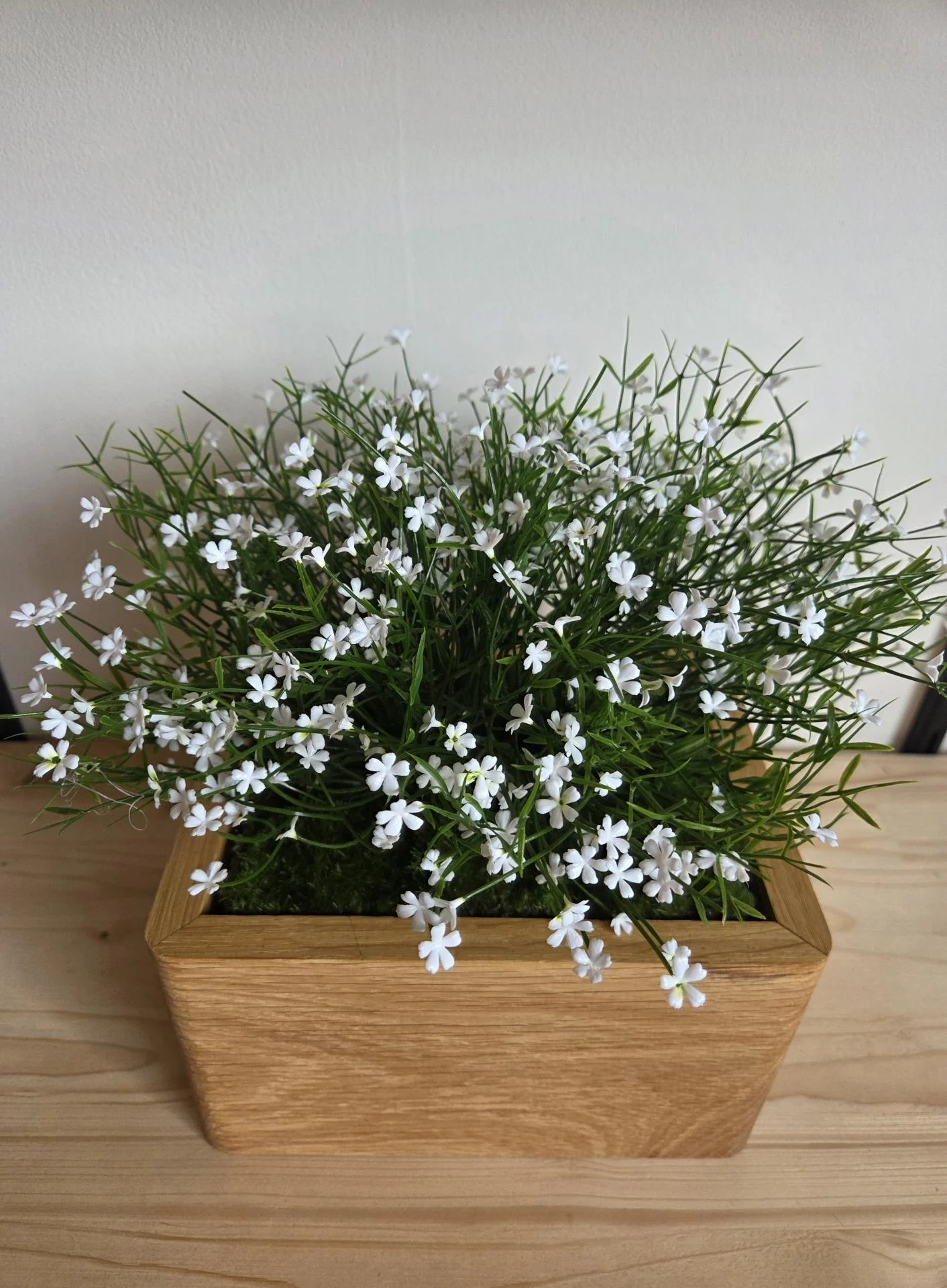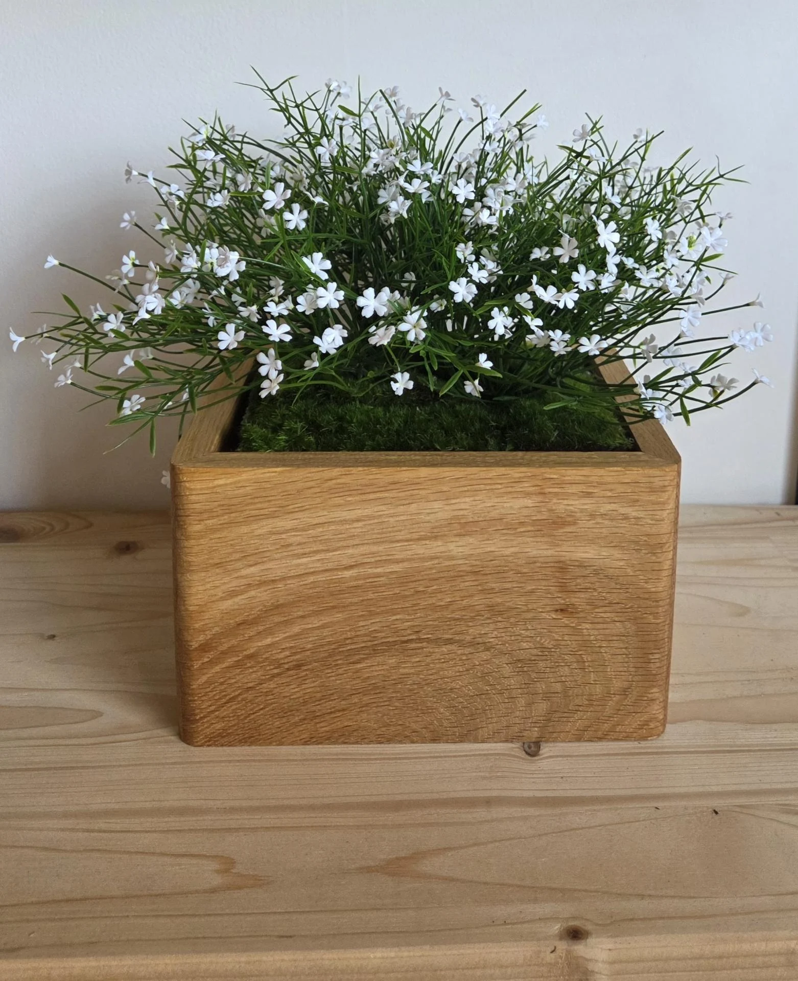 Urne en bois de chêne avec fleurs marguerites blanches artificielles. Fabriquée en France, elle est traitée à l'huile de lin biologique. Les cendres de l'animal reposent en dessous des fleurs.