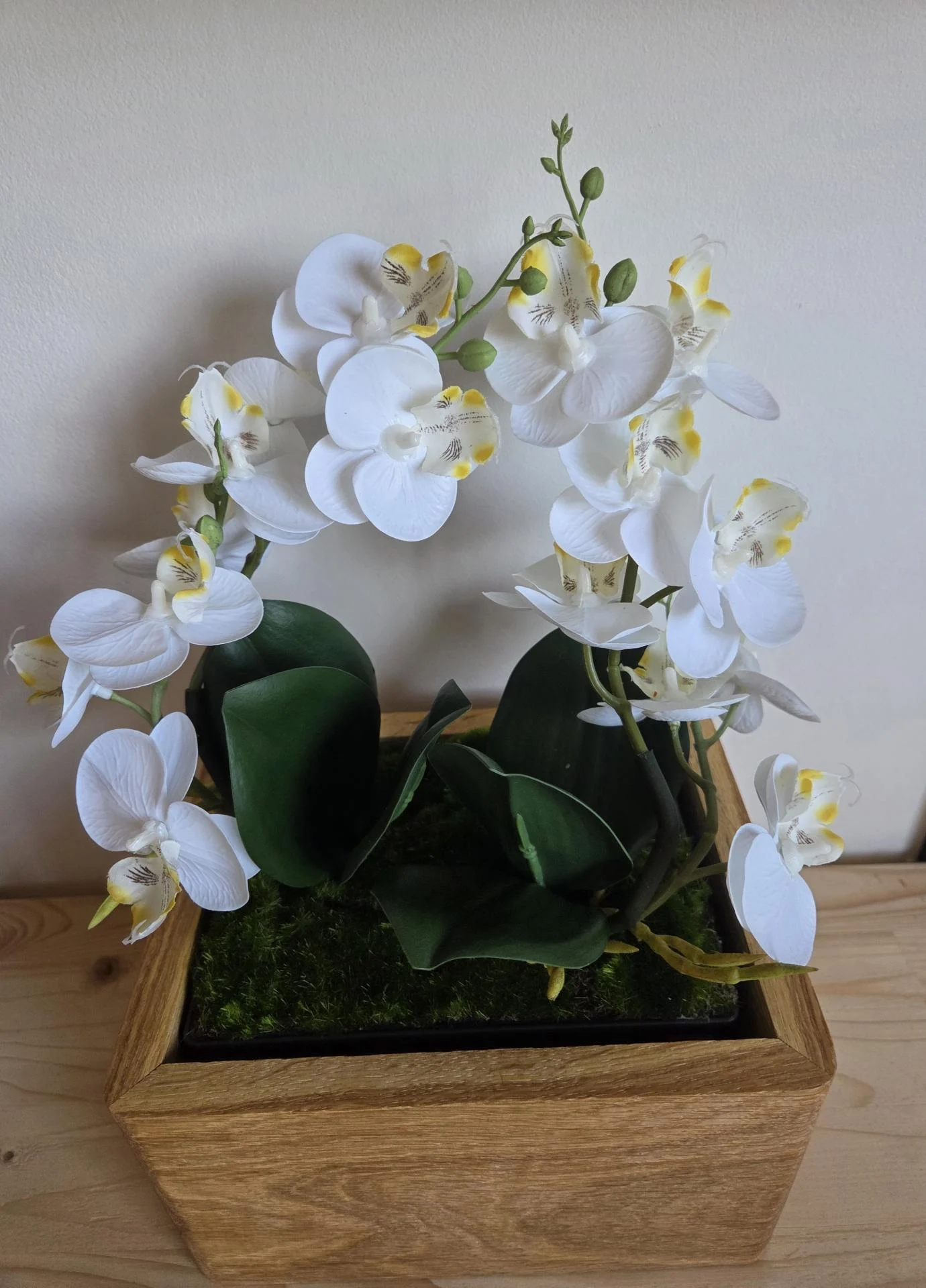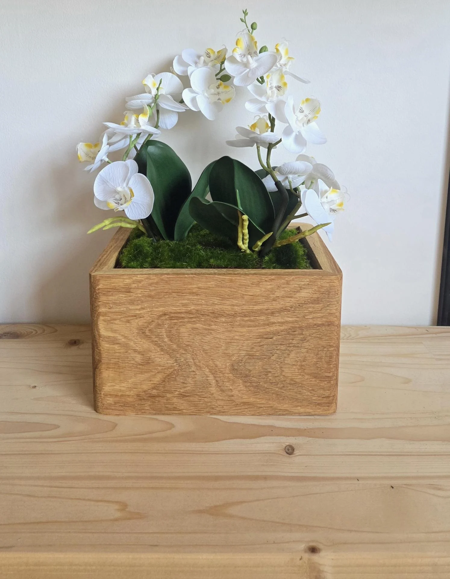 Urne en bois de chêne avec orchidées artificielles. Fabriquée en France, elle est traitée à l'huile de lin biologique. Les cendres de l'animal reposent en dessous des fleurs.